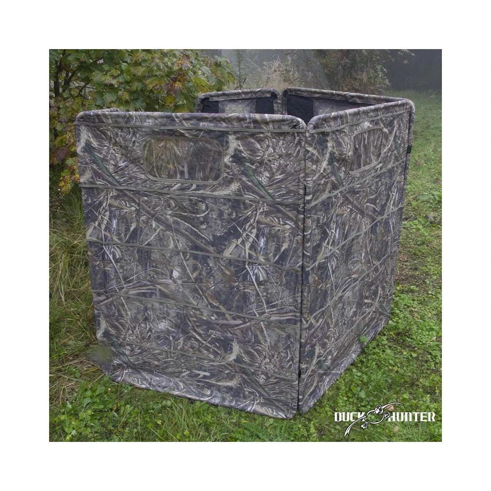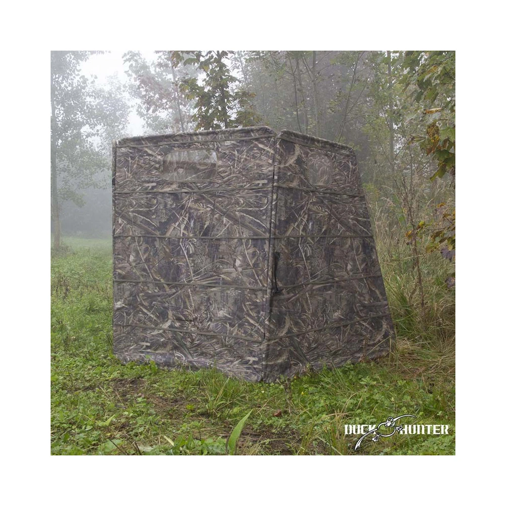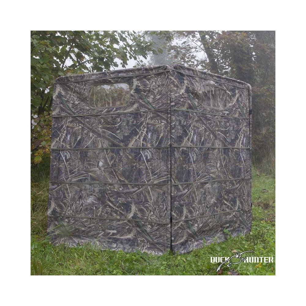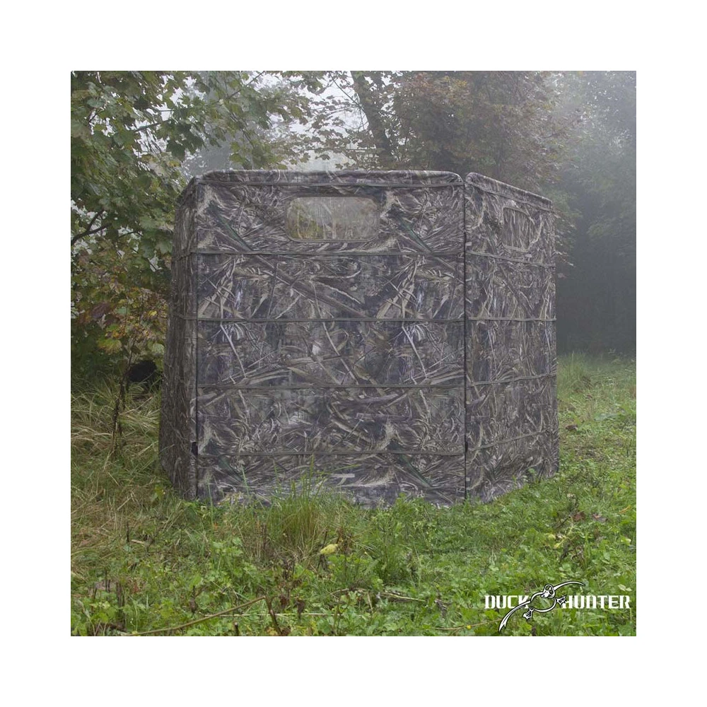 L’affût panneaux Duck Hunter est incontestablement l’affût le plus abouti de notre gamme jusqu’à présent. A la fois léger, polyvalent, rapide et facile à installer, pouvant accueillir 1, 2 jusqu’à 6 ou 8 chasseurs, il conviendra à tout les modes de chasse comme tout types de biotopes et d’installations. L’affût panneaux, comme son nom l’indique, est constitué de 5 panneaux : les trois centraux affichent des dimensions de 100 x 130 cm, chacun dispose d’une fenêtre permettant de visualiser les alentours sans être vu grâce à un filet amovible, maintenu à l’aide de scratch, celui-ci peut être retiré pour alors permettre au chasseur le tir au posé. Les deux panneaux aux extrémités sont de formes trapézoïdale, ils mesurent 90 (à la base) x 130 cm. Ils permettent de maintenir l’affût légèrement de biais afin de lui offrir une stabilité et d’adoucir les ombres. L’affût panneaux Duck Hunter est réalisé en toile épaisse imprimée du motif de camouflage Realtree Max5. Sur toute la façade, l’affût dispose de passants permettant de fixer de la végétation afin d’agrémenter le camouflage de celui-ci.