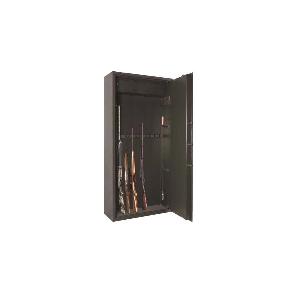 Le coffre Elite Alpha peut accueillir 12 armes longues, il affiche des dimensions de 150 x 65 x 30 cm, la hauteur intérieure utile est de 128 cm. Poids : 72 kg.