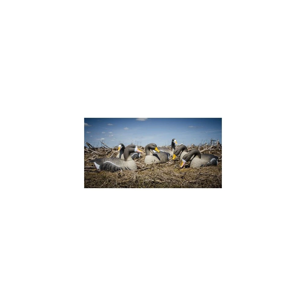 Les formes coquilles sont très polyvalentes : vous pouvez les installer sur une pâture, sur les berges de votre étang ou encore directement dans l’eau. Les différentes attitudes des têtes, amovibles, permettront de former un paquet rapidement et très réaliste. Le pack est composé de 6 blettes : 2 guetteuses, 2 actives et 2 repos. Les coquilles, une fois les têtes retirées, sont empilables les unes sur les autres, vous pourrez ainsi en transporter très facilement jusqu’à 36 dans un seul sac à blettes. Pour accroitre davantage, encore, le réalisme de ces formes, Higdon propose deux formes peintes aux couleurs d’une jeune oie rieuse.