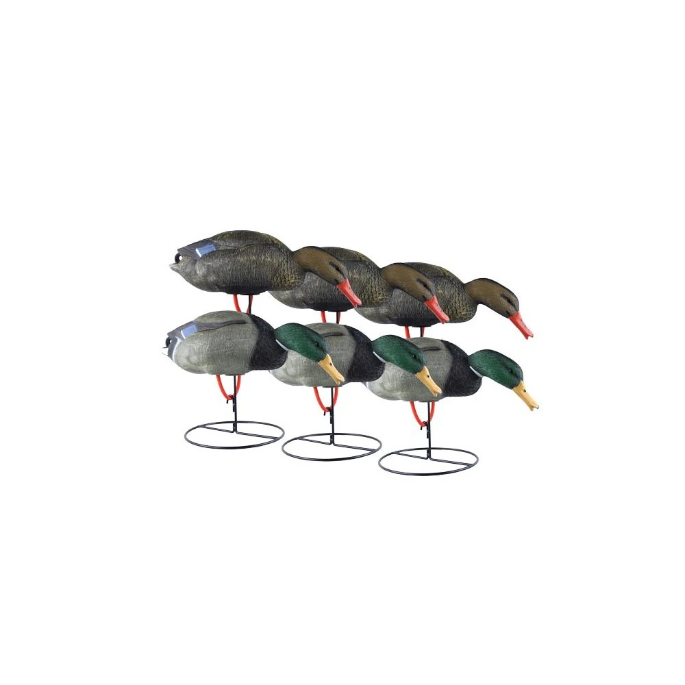 Pour agrémenter les berges de votre mare, pour vos chasses sur le DPM ou encore directement installées dans votre étang, les formes de colvert sur pattes Duck Hunter ajouteront du réalisme à votre attelage et lui offriront davantage de visibilité. Livrée avec un support métallique à poser au sol, les formes sont équipées d’un élastique en guise de pattes, celui-ci s’arrime sur le socle ce qui permet à la blette des mouvements naturels. Le pack est constitué de six formes, trois mâles et trois femelles, toutes sont en position « mangeur ».