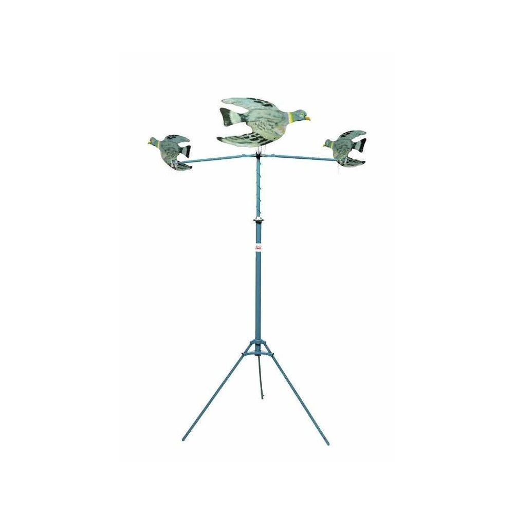 Jeu pour enfant : les trois pigeons tournent grâce à une spirale mécanique, attachés par un ressort, ils tombent lorsque touché par une flèche. Jeu livré complet : le manège et les trois pigeons, carabine à un coup et 6 fléchettes à ventouses.