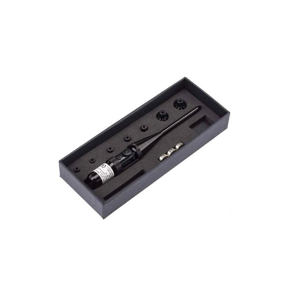 Le laser de collimatage de place à l’avant du canon de l’arme et indique précisément l’axe de tir grâce à une série d’adaptateurs pour différents calibres. En visant une surface claire, l’utilisateur n’a plus qu’à faire coïncider le réticule de la lunette avec le point laser projeté pour simbleauter sa lunette. Le réglage optimal se ferra à environ 20 mètres et à l’abri du soleil. Le réglage sera ensuite confirmé par des tirs réels. L’appareil est livré avec 7 adaptateurs pour calibres : . 22 / . 25 (6. 35mm) / . 30 (7. 62mm) / . 357 à . 40 (9 à 10mm) / . 50 (12,7mm) / cal 20 / cal 12. Livré avec 3 piles LR44 & 1 clef 6 pans.