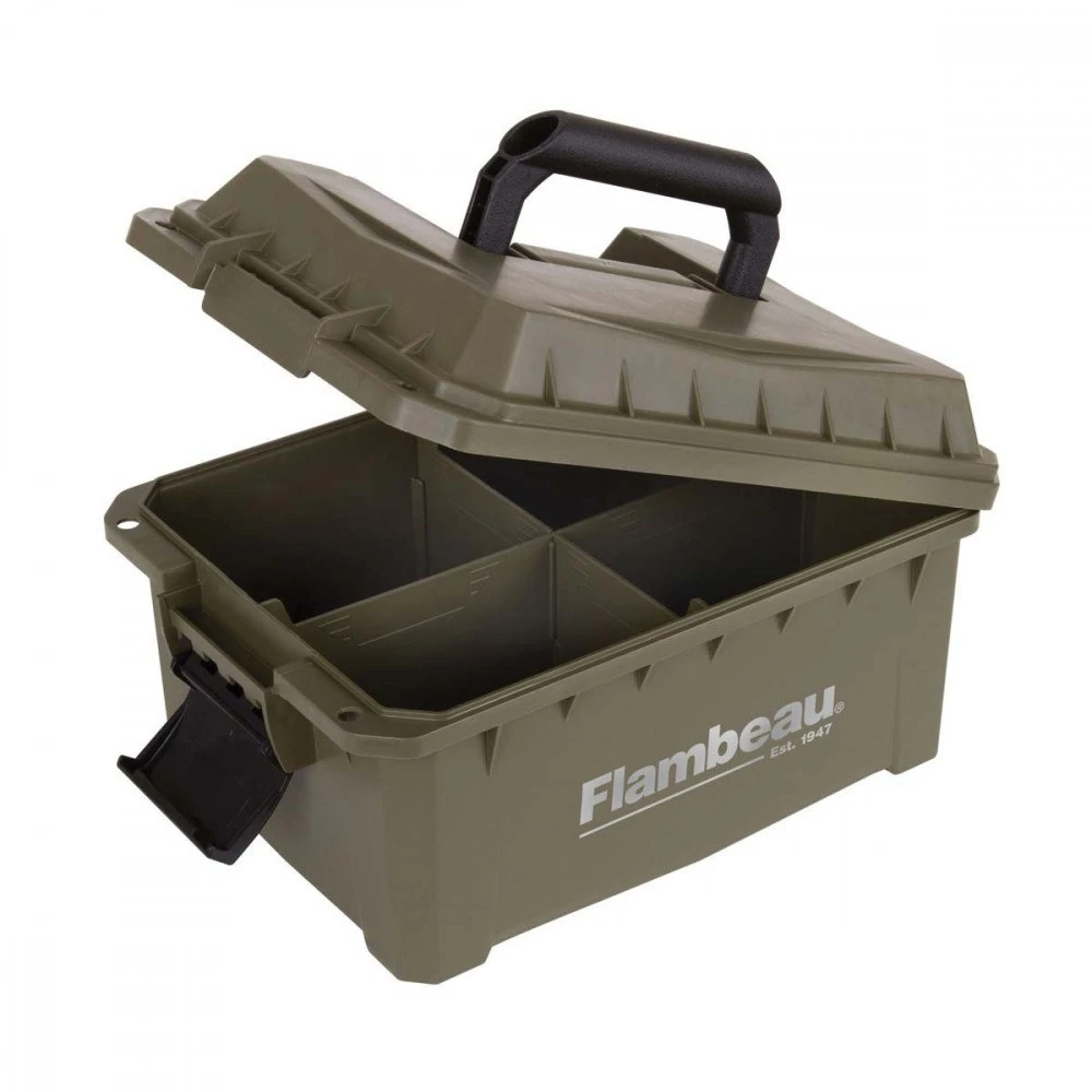 Petite mallette à cartouches compartimentés. Elle permet le stockage de 4 boites de cartouches de chasse de calibre 12/89. Les séparateurs sont amovibles. La mallette est étanche. Dimensions : 25 x 19 x 10 cm.