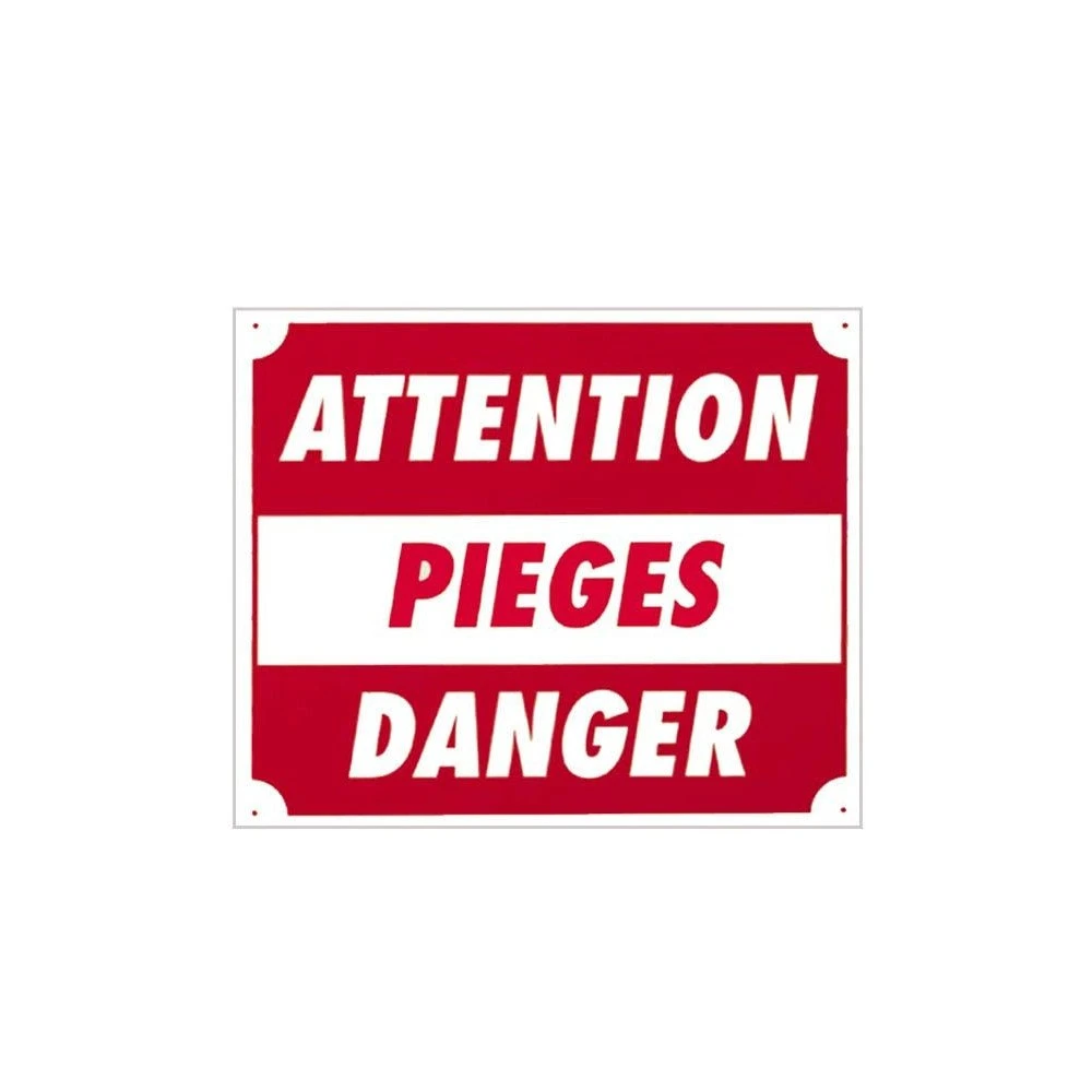 Pancarte fabriquée à partir d’Akilux, matière synthétique, légère, rigide et résistante. Dimensions : 30 x 25 cm. Intitulé du panneau : « Attention pièges danger »