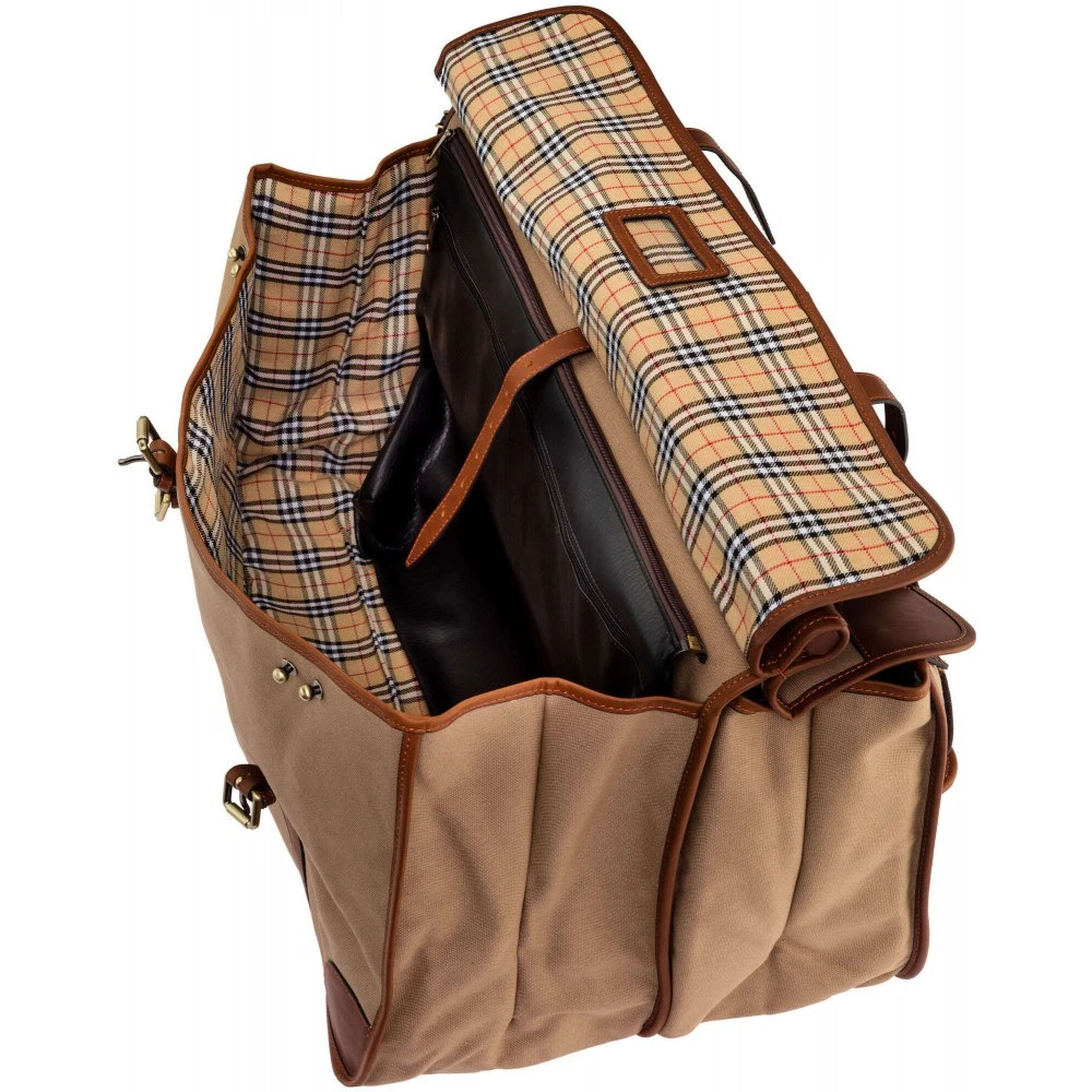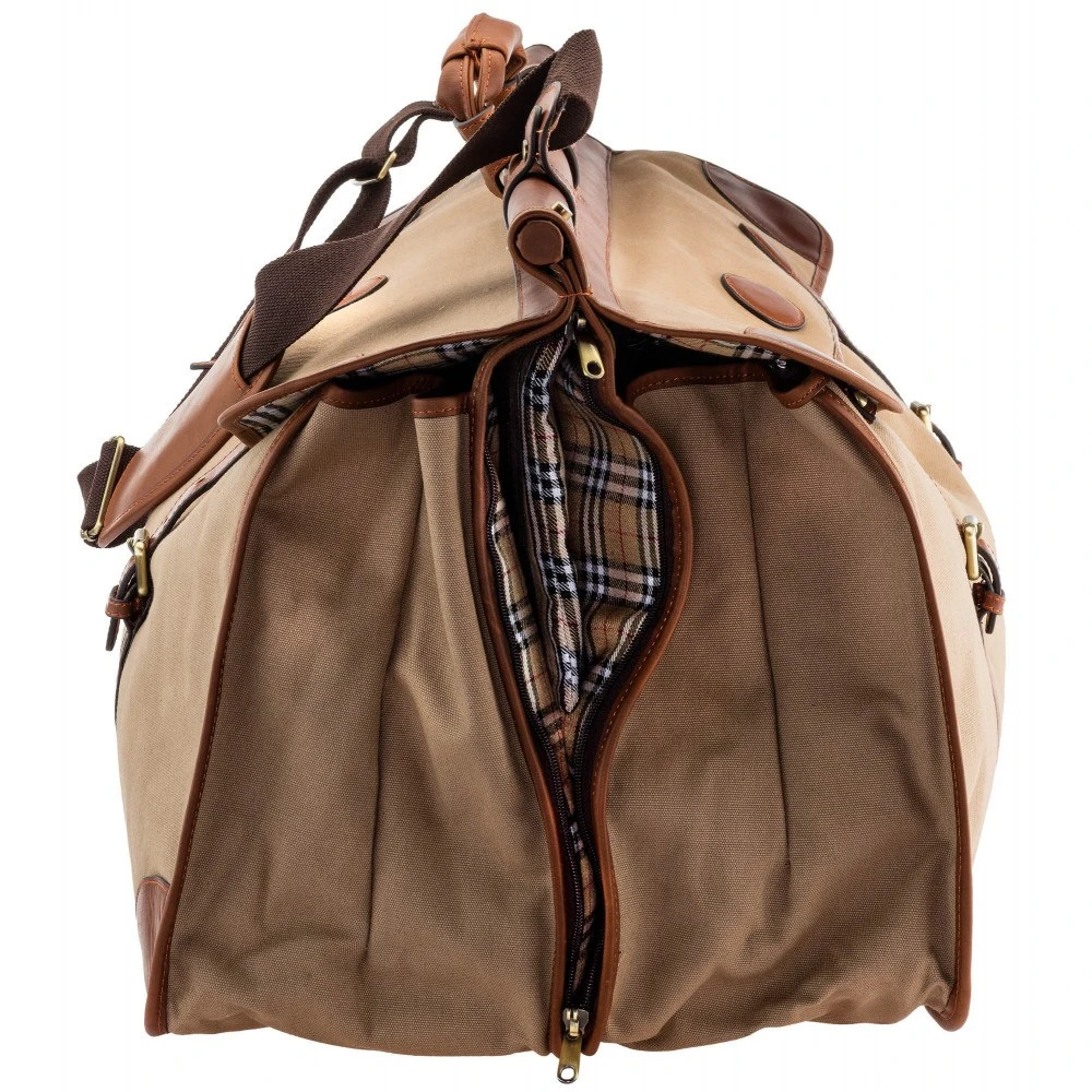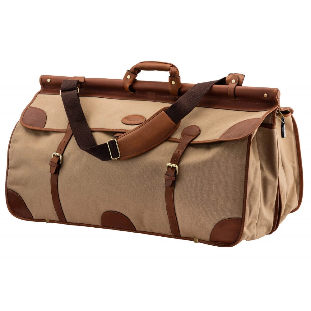 Collection toile coton, bordures et garnitures cuir pleine fleur. Les matériaux les plus nobles, un savoir-faire traditionnel extraordinaire, des modèles classiques : la gamme Country Sellerie répond aux besoins essentiels des chasseurs. Sa présentation soignée, attractive et exclusive apporte en outre un plaisir raffiné. Chacun des deux modèles présentés dans cette collection dispose de deux compartiments avec intérieur plastifié pour le transport de vos accessoires de chasse (bottes, veste, pantalon…). Plusieurs pochettes sont prévues pour y ranger vos documents personnels. Deux poches au centre des sacs permettent le transport d’un fusil. Collection toile coton , bordures et garnitures cuir pleine fleur. Livré avec une sangle bandoulière.